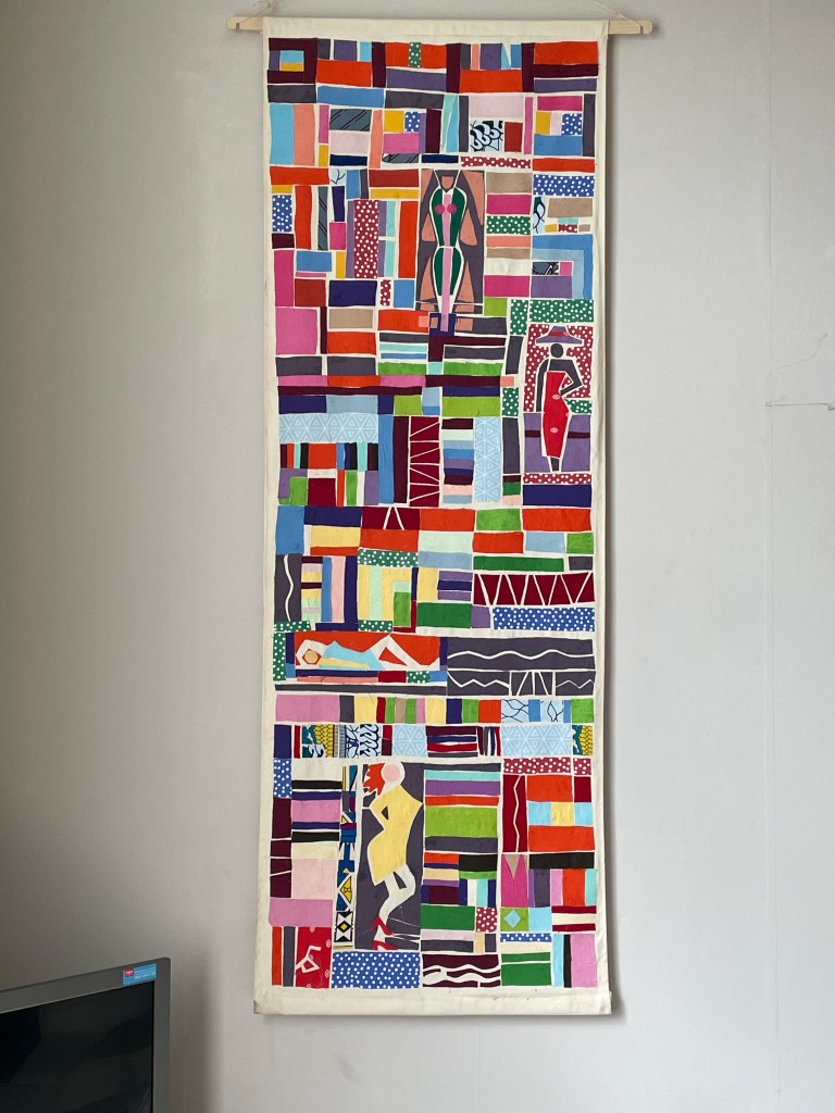 From the beginning of 2025 I have been embarking on a mission to create a body of work involving banners, produced in the same way as the much larger banners for the Art Al Vent international Textiles Art Festival which is held every year in the town of Gata De Gorgos, Spain. Here is one example. A wide selection of coloured and patterned fabric is cut out and stuck, piece by piece, onto a strip of heavy cotton calico. This takes a lot of time and of course a lot of collecting a very wide choice of fabric samples from commercially available as well as privately sourced swatches, old furnishing and garments, etc. On top of this the use of acrylic paint more often than not provides welcome areas of contrast, as here the circular forms are made from pre-painted calico, left to dry, cut to shape and incorporated in the overall design. You may notice in this banner the existance of a pink unicorn? Inpired by my three year old grandaughter who loves unicorns, this busy hanging art work does what most of my work eventually does: it operates in the space between the personal and public, the heart and the eye. I have produced around ten new banners so far of various sizes and hope to exhibit them in the future. this is my latest: VOGUE. Textile art banner. 2025. 66 x 192 cm.